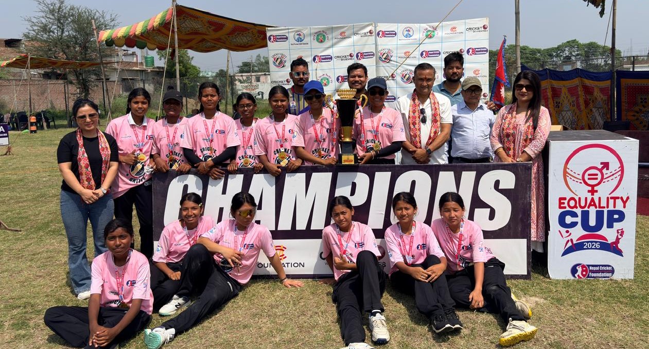विराटनगर, ३० चैत । विराटनगरमा जारी पाँचौँ संस्करणको इक्वालिटी कप क्रिकेट प्रतियोगिताको उपाधि विराटनगर हवले जितेको छ। नेपाल क्रिकेट फाउण्डेसन द्वारा आयोजित प्रतियोगितामा विराटनगर हवले राजविराज हवलाई ११ रनले पराजित गर्दै उपाधि आफ्नो नाममा पार्न सफल भएको हो। टस हारेर पहिले ब्याटिङ