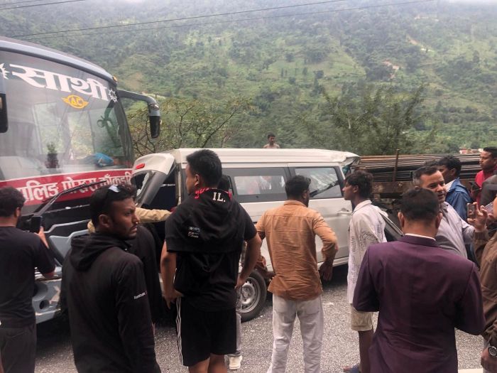 इनरुवा, १ कर्तिक । मुग्लिन–नारायणघाट सडक खण्डअन्तर्गत चितवनको गाईघाट क्षेत्रमा सात वटा गाडीहरु एक आपसमा ठोक्किएका छन् । बिहान साढे ७ बजेतिर ट्रकले यात्रुबसलाई ठक्कर दिएपछि बसको पछाडि रहेका अरू गाडी पनि ठोक्किन पुगेका हुन् ।