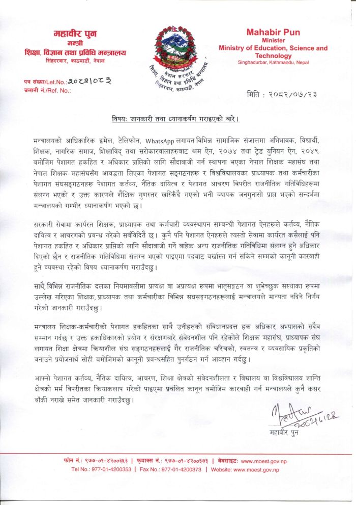शिक्षा, विज्ञान तथा प्रविधि मन्त्री महावीर पुनले सार्वजनिक रूपमा ध्यानाकर्षण पत्र जारी गर्दै दलमा संलग्न भएको पाइएमा कानूनी कारबाही गर्ने बताएका हुन्।