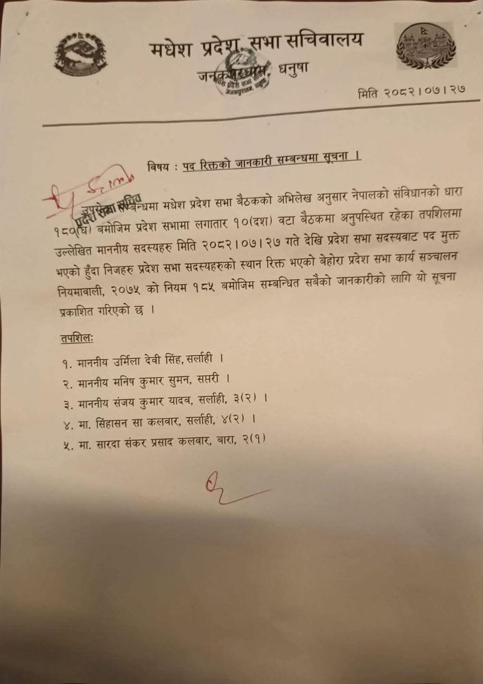 सभामुखले सार्वजनिक गरेको सूचनामा भनिएको छ “मधेश प्रदेश सभा बैठकको अभिलेख अनुसार नेपालको संविधानको धारा १८० बमोजिम लगातार १० बैठक अनुपस्थित रहेका तल उल्लेखित माननीय सदस्यहरू मिति २०८२/०७/२७ गतेदेखि प्रदेश सभा सदस्यबाट पदमुक्त भएको हुँदा उनीहरूको स्थान रिक्त भएको जानकारी प्रदेश सभा कार्य सञ्चालन नियमावली २०७५ को नियम १८५ बमोजिम सूचित गरिन्छ।”