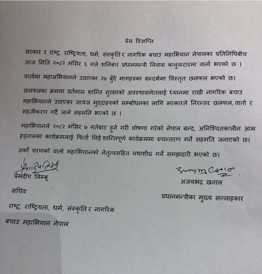 शनिबार बालुवाटारमा सरकार र महाअभियान नेपालका प्रतिनिधिबीच भएको वार्ताबाट उक्त सहमति बनेको हो। वार्तामा महाअभियानले पेश गरेको २७ बुँदे मागसम्बन्धी विस्तृत छलफल गरिएको थियो। त्यसैको आधारमा आजबाट सुरु हुने भनिएको नेपाल बन्द कार्यक्रम स्थगन गरिएको हो।
