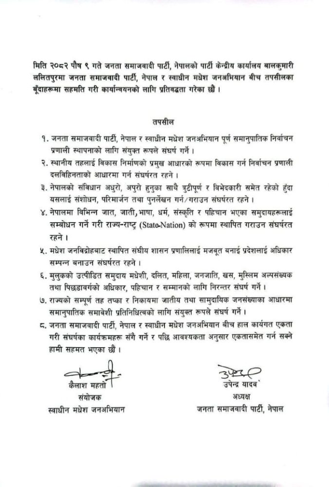 कार्यक्रममा जनता समाजवादी पार्टी, नेपालका अध्यक्ष उपेन्द्र यादव र स्वाधीन मधेस जनअभियानका संयोजक कैलाश महतोले कार्यगत एकता प्रतिबद्धतापत्रमा हस्ताक्षर गरेका थिए।