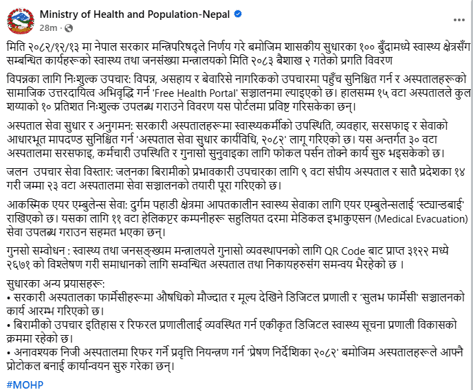 इनरुवा, २ वैशाख । स्वास्थ्य तथा जनसंख्या मन्त्रालयले सरकारको शासकीय सुधारका १०० बुँदाअन्तर्गत स्वास्थ्य क्षेत्रका कामहरूको प्रगति सार्वजनिक गर्दै विपन्न नागरिकका लागि निःशुल्क उपचार सेवा सुरु भइसकेको जनाएको छ।